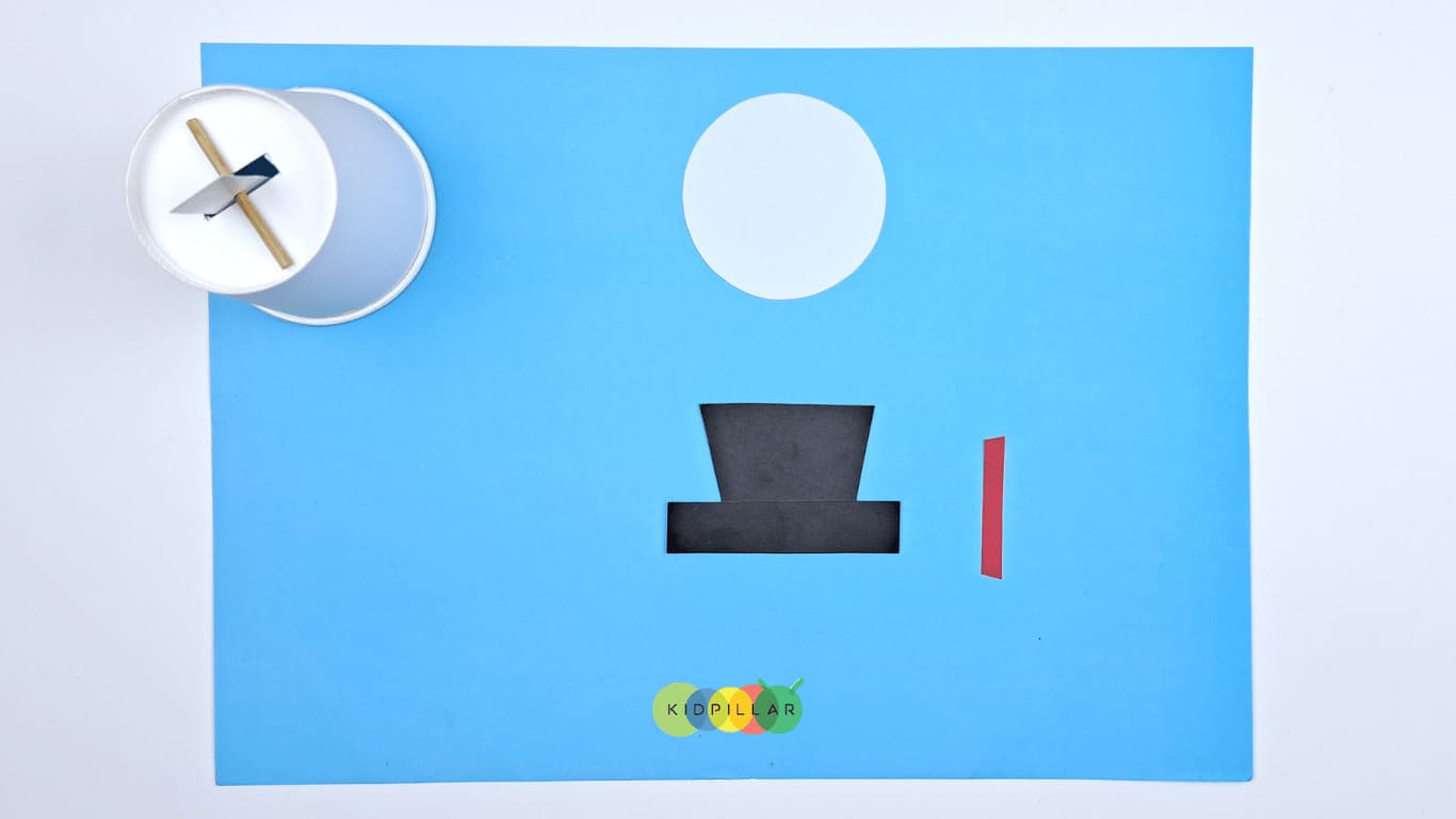 Step 4: Next, cut out a white circle, a black hat and a red strip from construction paper.