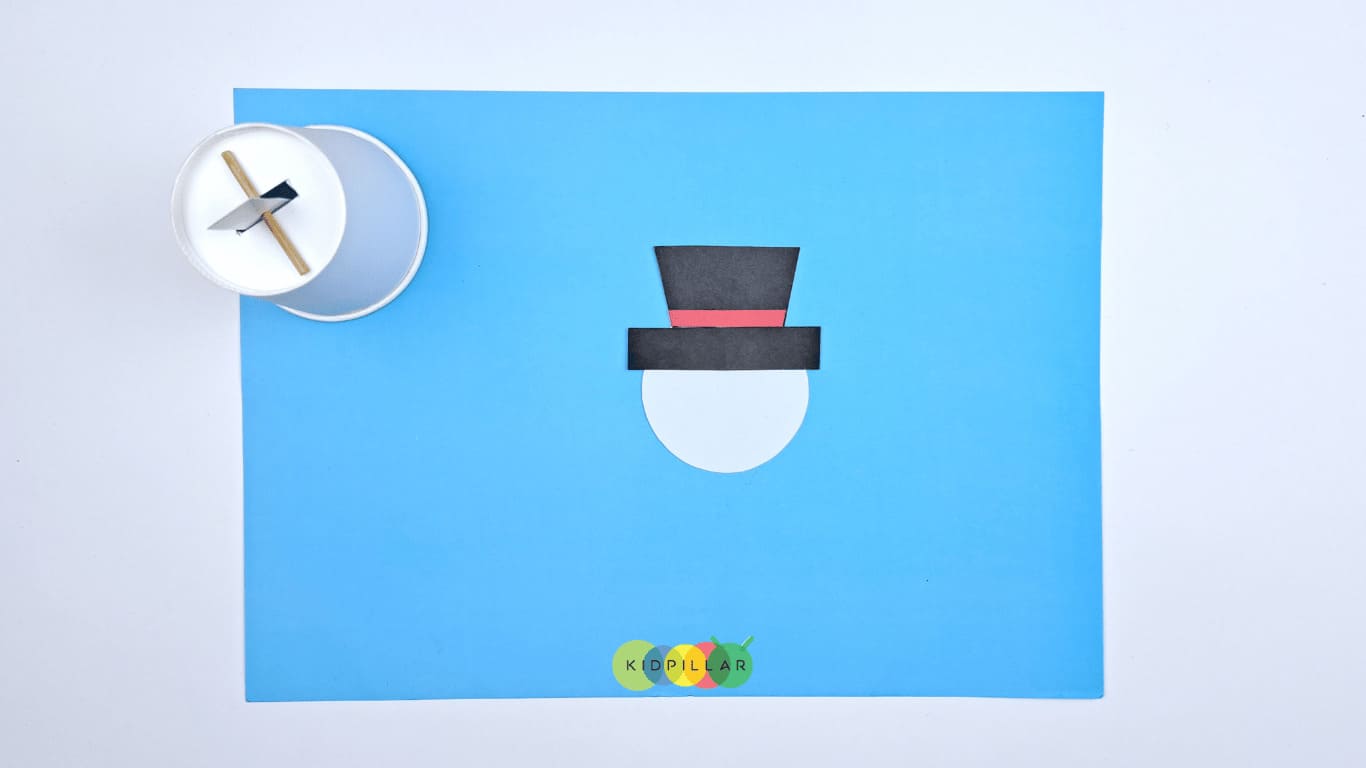 Step 5: Glue the red strip on the black hat and paste the completed hat on the white circle to complete the face of the snowman craft.
