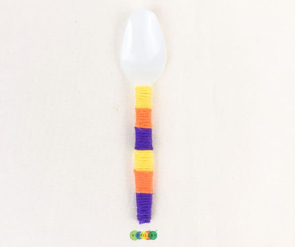 Step 4: To make the body of the butterfly use a plastic spoon and wrap yarn around the stick of the spoon to create an eye-catching pattern.