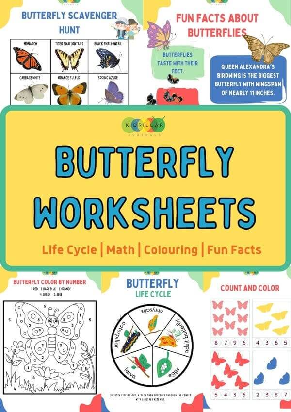 Once your kids are done with their butterfly craft, indulge them in these Free Butterfly activity sheets that include Butterfly life cycle, coloring pages, color-by-number, Butterfly scavenger hunt, butterfly math as well as butterfly fun facts!