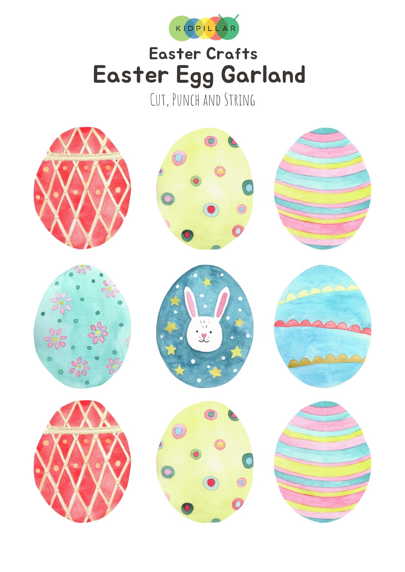 Simply print the free template (we also have a plain template for your creative kids who want to decorate the eggs their way!), cut and string using bakers twine and your Easter garland craft is ready to go!