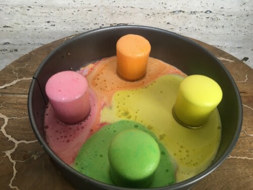 2. Add drops of different food coloring to the shaving foam and mix them up using a skewer.