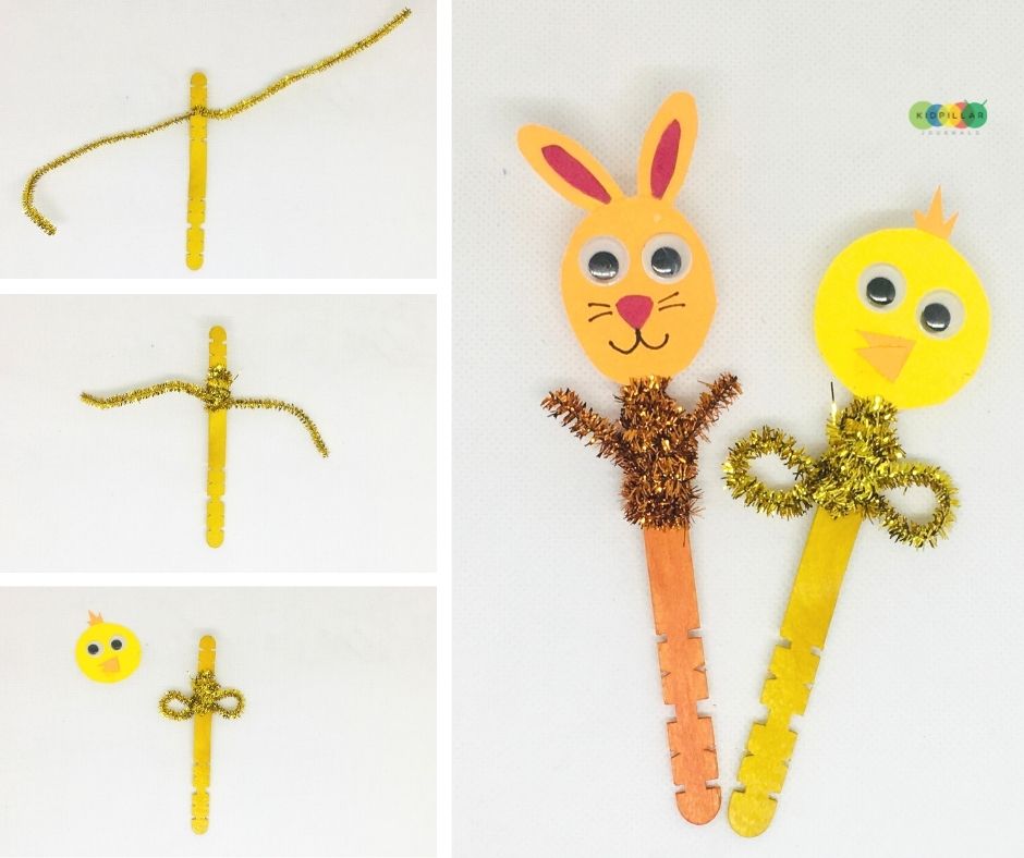 4. Take a yellow popsicle stick and wrap yellow pipe cleaner around it 3-4 times. Fold the ends of the pipe cleaner in a drop shape to make wings of the chick.